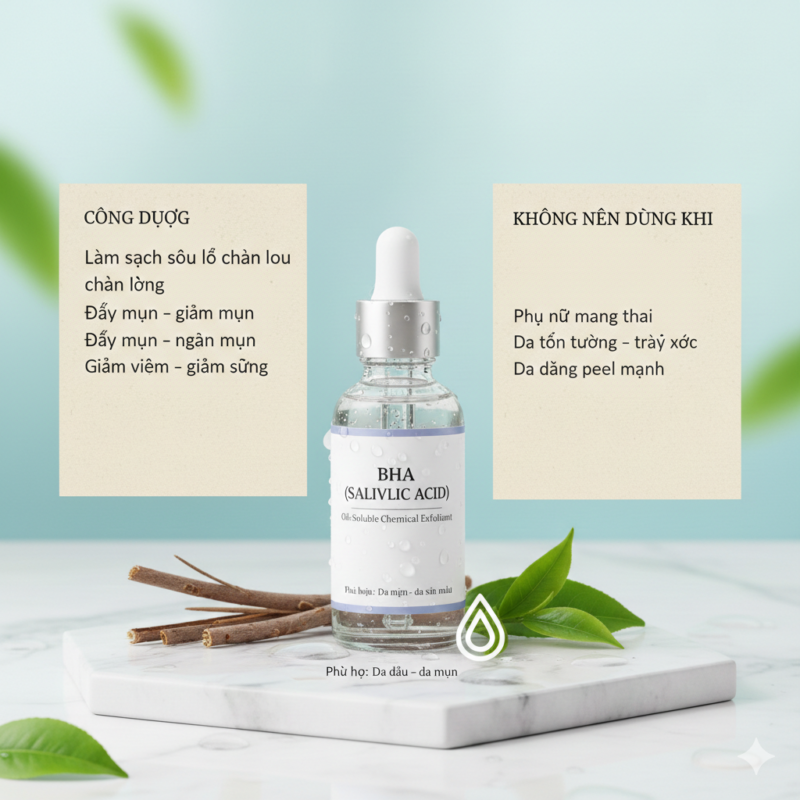 BHA là hoạt chất tẩy tế bào chết hóa học tan trong dầu, giúp làm sạch sâu lỗ chân lông và hỗ trợ giảm mụn hiệu quả.